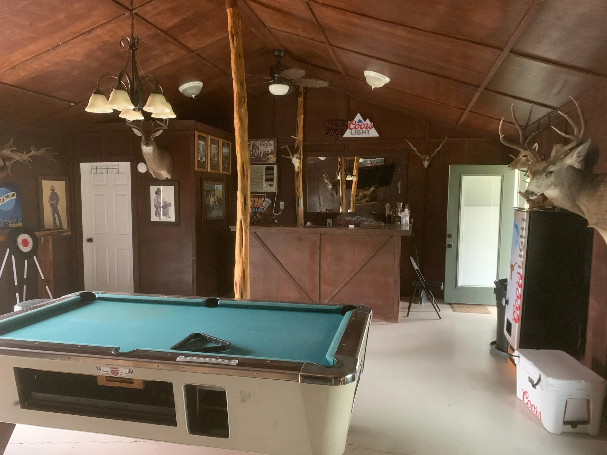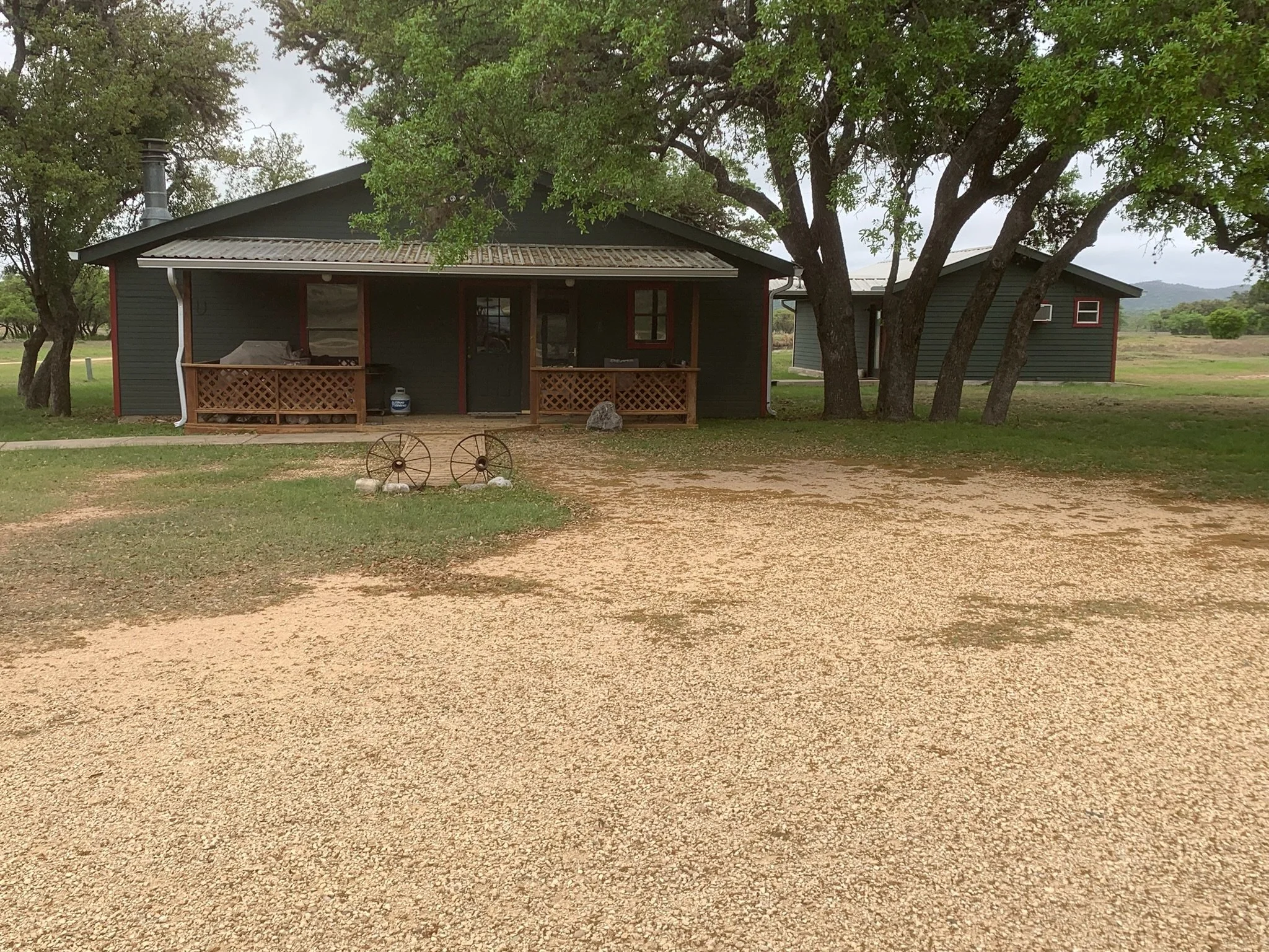 The lodge is comfortable, clean, and no-frills. It sleeps up to eight guests and sits right on the property with views of the hills and creek. There’s a separate game room with a TV and space to spread out.